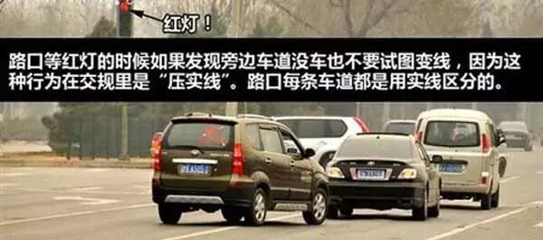 开车都会遇到这种情况,路况等红灯的时候发现你自己的车道前面已经有一台车停在那了,而旁边的车道没有车停在那里,为了能在变绿灯的时候快点开走,在这种情况下相信大多数都会选择从自己的车道变到没有车的那条车道上,但就是这么一动你就违法了,违法原因:压实线。