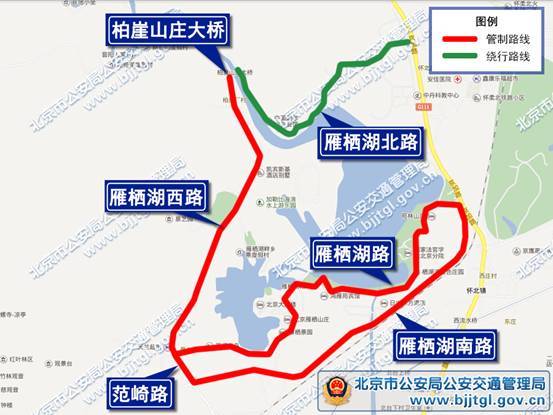 5月7日至5月15日活动结束,雁栖湖国际会都周边道路采取临时交通管理措施,由怀柔区会都路范崎路口(不含)经范崎路、雁栖湖西路至柏崖山庄大桥(不含),雁栖湖路,雁栖湖南路,除持有“高峰论坛”专用证件的车辆外,禁止其他车辆通行;社会车辆和公交车经雁栖湖北路绕行,绕行路线沿线禁止停放机动车辆。
