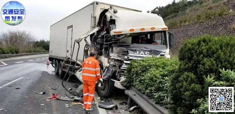 浙江高速交警宁波支队民警赶到现场发现,厢式货车车头骑跨在中央护栏上,副驾驶位置严重受损,车窗玻璃碎了一地。