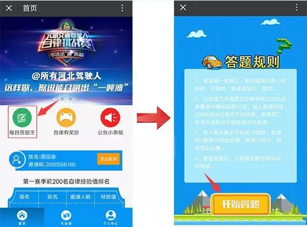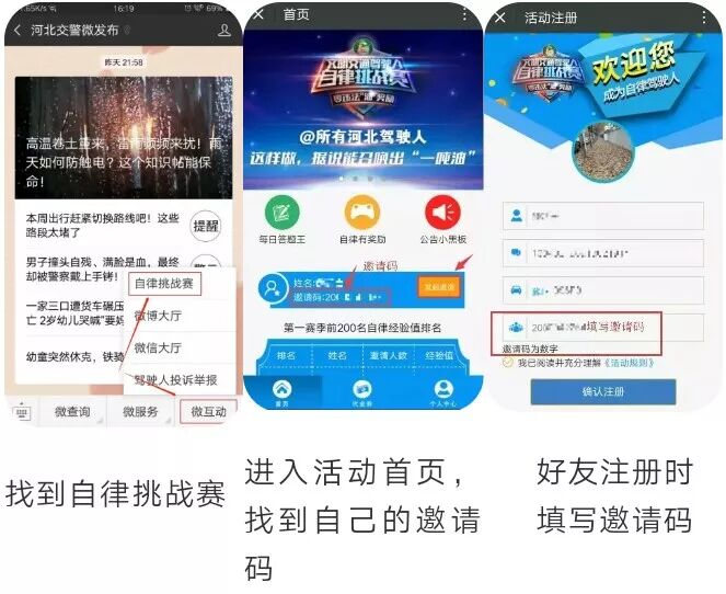 关注中国石油智慧加油站微信(必备)、河北公安交管网微信、河北交警微发布微信,点击微信功能菜单“自律挑战赛”报名吧!